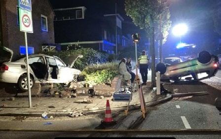 afgesloten voor onderzoek. Volgens de politie botsten de twee auto’s frontaal. Eén auto sloeg over de kop, de andere belandde in een tuin nadat een stenen muurtje was geraakt. De Forensische Opsporing verkeer onderzoekt de toedracht van de aanrijding.