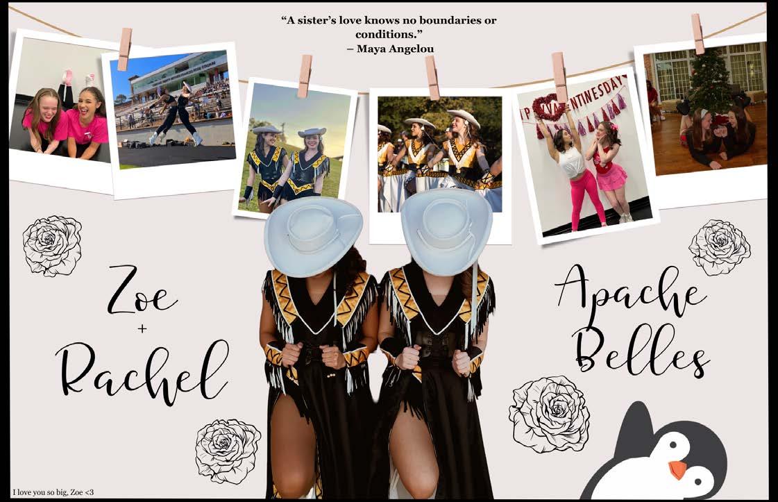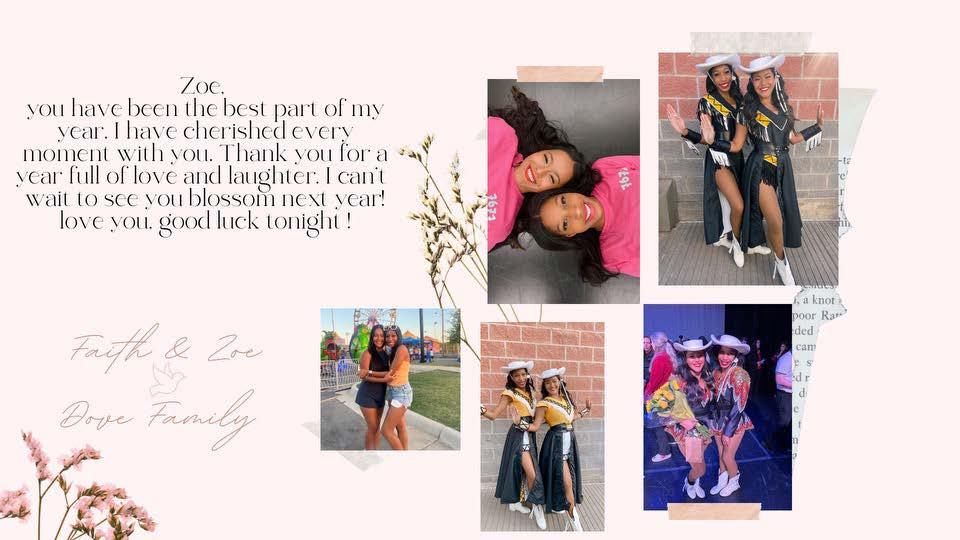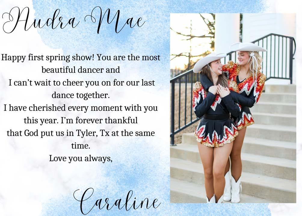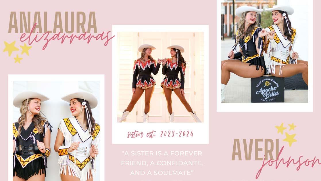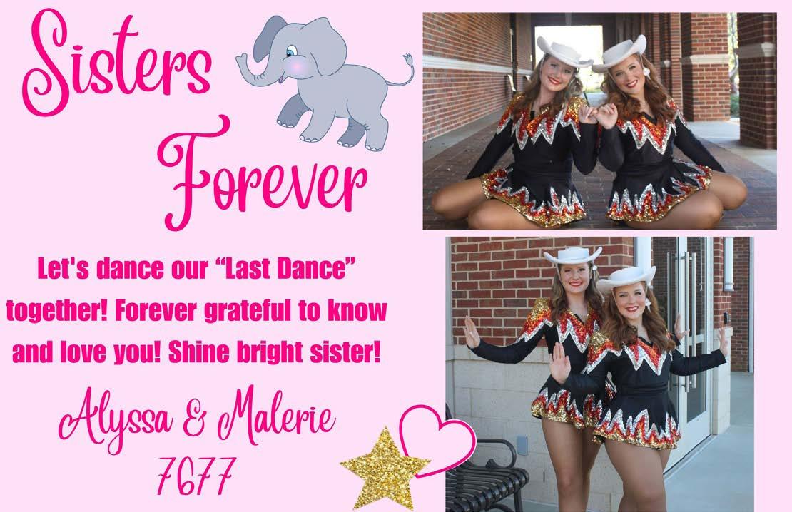 As this year is coming to a close, I wanted to express how proud I am of ya’ll for completing your first year as an Internationally Famous Apache Belle and as a new college student. You both have improved tremendously and I have enjoyed watching you guys blossom into such beautiful, kind and talented Apache Belles. I am so thankful every day for our sister bond & friendship. I will miss dancing with ya’ll next year, but at the same time will really enjoy bring apart of the audence cheering you on in your performanced. This is a sister bond that will last forever. I love you guys to the moon and back.