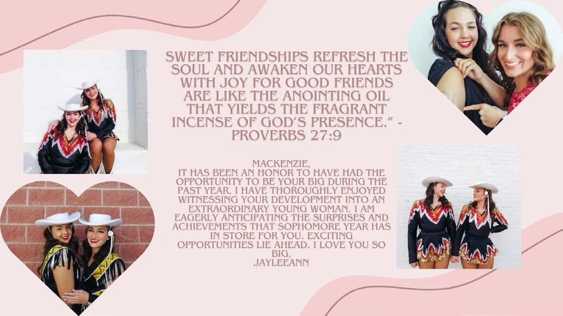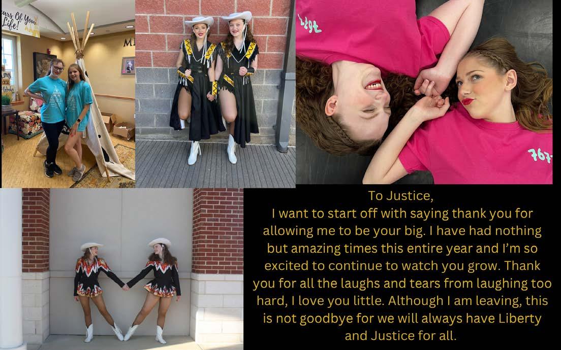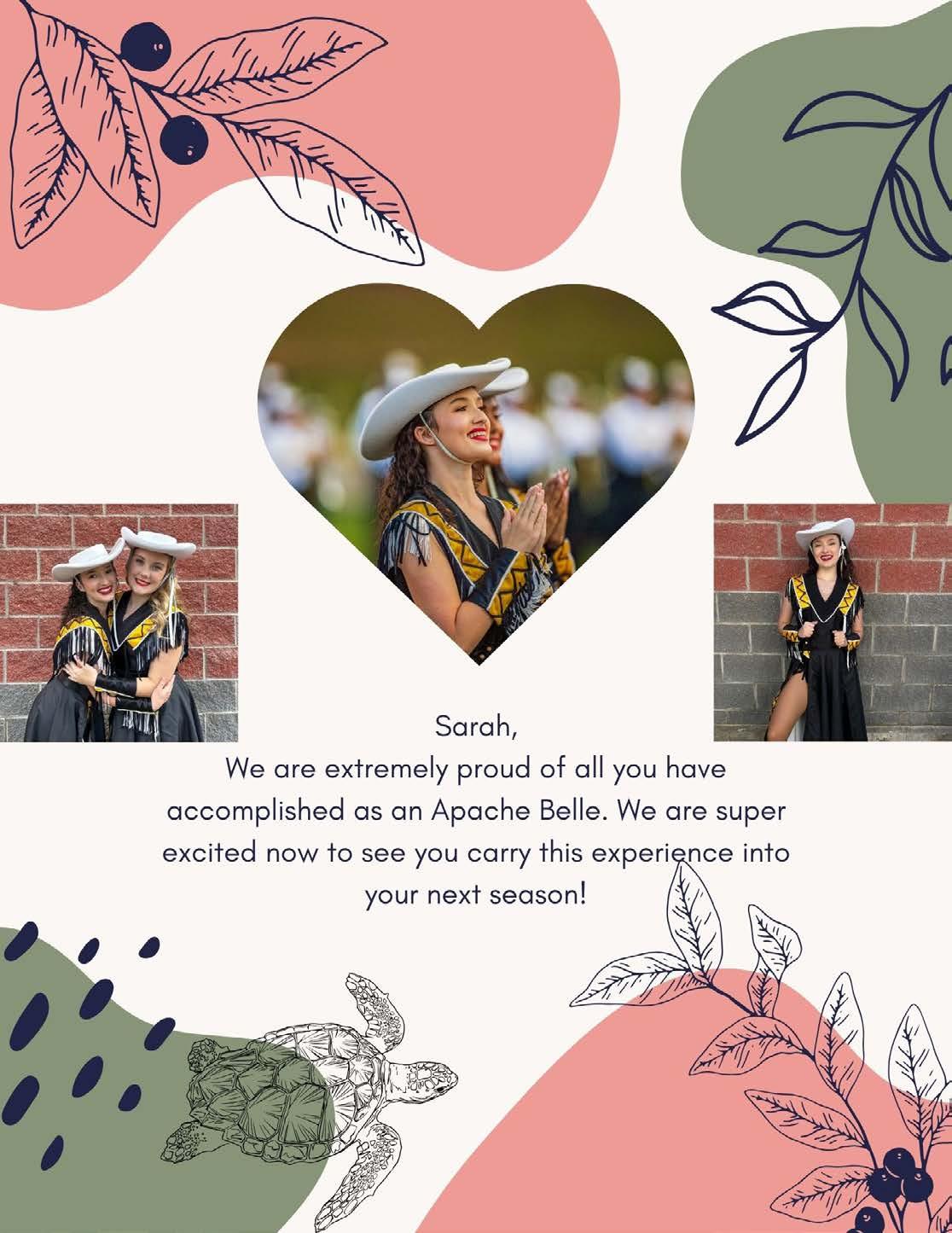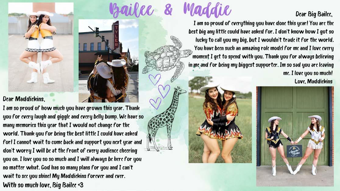 As this year is coming to a close, I wanted to express how proud I am of ya’ll for completing your first year as an Internationally Famous Apache Belle and as a new college student. You both have improved tremendously and I have enjoyed watching you guys blossom into such beautiful, kind and talented Apache Belles. I am so thankful every day for our sister bond & friendship. I will miss dancing with ya’ll next year, but at the same time will really enjoy bring apart of the audence cheering you on in your performanced. This is a sister bond that will last forever. I love you guys to the moon and back.