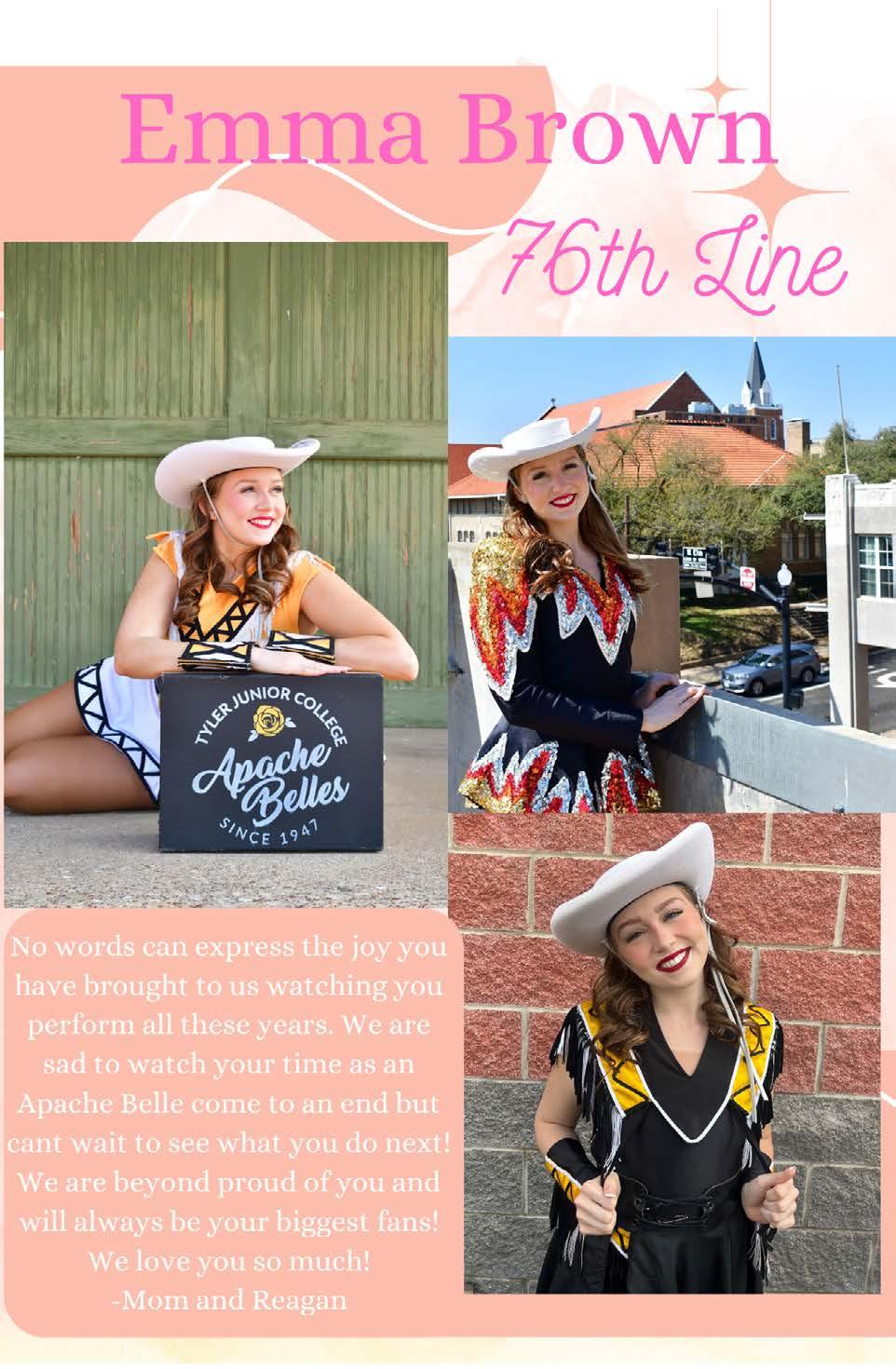 It is my honor to welcome you to Belle Land, home of the Internationally Famous Apache Belles! The Tyler Junior College Apache Belles continue to be a symbol of beauty, grace, and unparalleled talent, and it is for this reason that Family Weekly has hailed them as “the prettiest drill team in the world,” attributing this special recognition to Apache Belles everywhere.