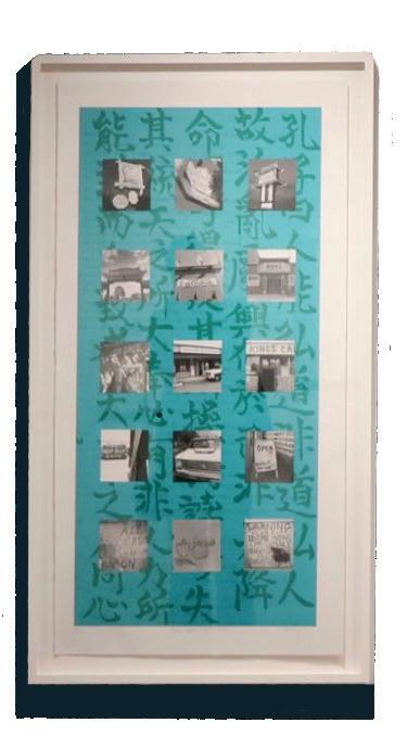 To create the piece, Wong glued blackand-white photographs to contact sheets, double-exposed prints, other photographs and even a cafe menu — blending various techniques of screenprinting and film photography. The final products are five differently coloured panels of intentionally scrapbooked layers.