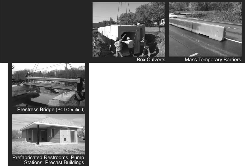 Concrete Systems, Inc.: Manholes & Catch Basins, Box Culverts, Utility Structures, Special Box Structures, Containment Vaults, Fire Cisterns, CSI Arc-Span™ Bridges, Rigid Bridge ™ Systems, Bridge Deck Slabs, Permanent & Temporary Median Barrier, Uwall™ Retaining Wall Systems, Stablewall™ Retaining Wall, Headwalls & Wingwalls. Clampcrete Construction Systems: TL-4 Anchored Barrier for Roadway Structures. Tunnel Systems: Precision Segmental Tunnel Lining Rings. Cleco Manufacturing: Precision Fabricated Forms & Forming Systems, Complete Plant Design, Batch Plant Computer Automation, Countercurrent Mixers & Concrete Delivery Systems.