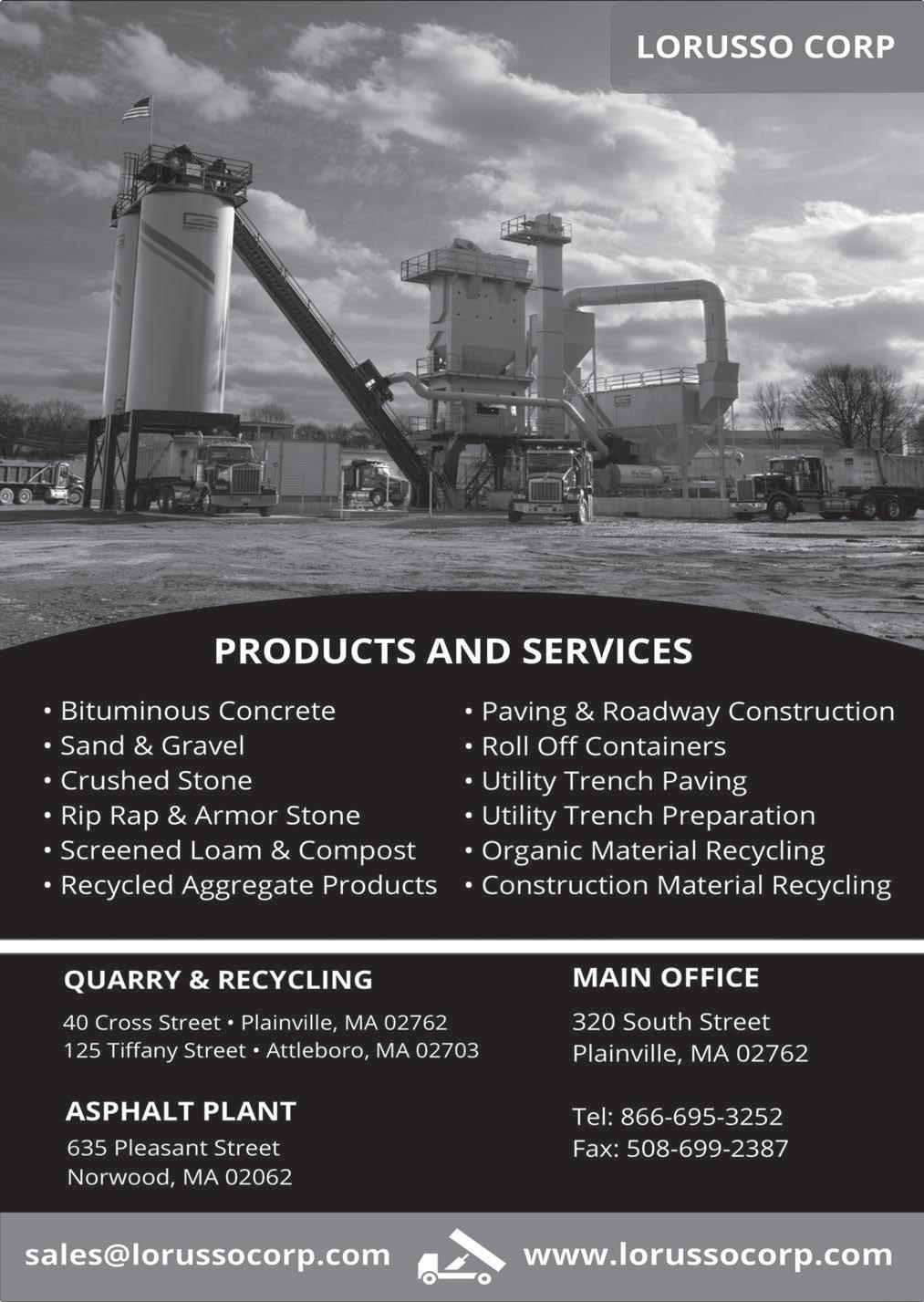 Advertisers’ Index 21st Century Concrete, Inc 75 ATS Equipment, Inc. ............................................................................. 42 Badger Daylighting 22 Benevento Companies 68 Boro Sand & Stone Corp. 51 Brennan Consulting 47 Dennis K. Burke, Inc.............................................................................. 11 C&S Insurance Agency 28 Chadwick BaRoss 33 Concrete Systems, Inc. Inside Back Cvr. Core & Main 4 Cumberland Quarry Corp. ................................................................... 27 Dagle Electrical Construction Corp. 26 Darmody, Merlino & Co., LLP 68 Dedham Recycled Gravel 74 DeSanctis Insurance Agency, Inc. 59 Dig Safe System, Inc. 64 The Driscoll Agency 17 Eastpoint Lasers, LLC 19 T. L. Edwards, Inc. 66 Ferguson Waterworks 13 Genalco, Inc. 49 L. Guerini Group, Inc. 72 Henniker Directional Drilling, LLC ................................................... 15 Hinckley Allen LLP 10 & 60 John Hoadley & Sons, Inc. 59 Industrial Safety & Rescue 29 JESCO 9 P. J. Keating Company ........................................................................... 18 Klayman Public Insurance Adjusters 75 P. A. Landers, Inc. 16 Lawrence-Lynch Corp. 58 Lorusso Corp. 24 Lorusso Heavy Equipment, LLC.......................................................... 56 Mass Broken Stone Company 59 McGovern Ford of Framingham 65 Mersino Dewatering 30 Milton CAT Back Cover Milton Rents ............................................................................................ 51 Monroe Tractor 72 National Trench Safety 6 Norfolk Power Equipment, Inc. 34 North American Crane & Rigging LLC 14 North East Shoring Equipment, LLC.................................................. 62 Northwestern Mutual 20 Ocean State Oil 68 Pawtucket Hot Mix Asphalt 34 Podgurski Corp. 46 E. J. Prescott, Inc............................................................... Ins. Front Cvr. Putnam Pipe 72 Rain For Rent-New England 12 Read Custom Soils 27 Ritchie Bros. Auctioneers 48 Scituate Concrete Products Corp. ....................................................... 44 Scrap It, Inc. 23 Shea Concrete Products, Inc. 8 SITECH New England 54 Starkweather & Shepley Ins. Brokerage, Inc. 32 Swenson Granite Company LLC ......................................................... 36 Taylor Oil Northeast, Inc. 75 Tonry Insurance Group, Inc 11 Triumph Modular Inc 50 United Concrete Products 73 United Construction & Forestry, LLC .................................................. 1 Webster Printing & Packaging 19 C. N. Wood Co., Inc. 2 World Insurance Associates LLC 70 76 “BUY FROM THE ADVERTISERS IN CONSTRUCTION OUTLOOK” MAY, 2024