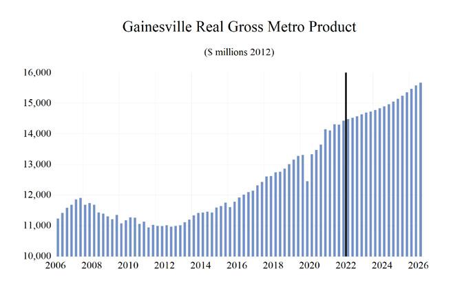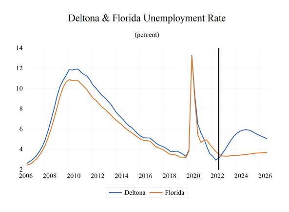 • From 2022-2025, Florida’s economy, as measured by Real Gross State Product, will expand at an average annual rate of just 1.0%. Real Gross State Product will mildly contract during the recession as growth will slow to -0.2% in 2023, turn positive in 2024, and growth begins to accelerate in 2025 to 1.7%.