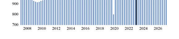 2023Q2 2023Q3 2023Q4 2024Q1 2024Q2 2024Q3 2024Q4 2025Q1 2025Q2 2025Q3 2025Q4 2026Q1 2026Q2 Personal Income 1508.0 1525.8 1539.2 1558.4 1572.5 1589.2 1606.8 1628.6 1648.0 1670.1 1690.1 1711.2 1732.6 Wages & Salaries 689.2 692.9 695.0 698.4 701.6 705.0 709.0 712.2 716.6 724.5 730.9 738.0 746.3 Other Labor Income 132.2 132.5 133.2 134.2 135.0 136.0 136.8 137.9 138.7 140.2 141.6 143.2 144.6 Nonfarm 76.3 78.7 80.6 81.7 82.4 83.2 84.3 85.5 86.7 88.2 89.6 90.8 92.4 Farm 1.5 1.5 1.7 1.9 2.2 2.3 2.4 2.5 2.6 2.6 2.6 2.6 2.6 Property Income 418.7 428.0 434.8 442.5 450.2 459.9 469.5 480.4 490.5 498.6 506.7 513.6 520.7 Transfer Payments 290.6 293.3 295.5 302.4 304.5 306.8 309.5 315.7 319.3 323.3 327.1 332.9 337.1 Social Insurance 104.6 105.2 105.8 106.9 107.4 108.1 108.8 109.8 110.4 111.7 112.6 114.2 115.4 Personal Income 1169.8 1175.8 1178.7 1187.4 1190.7 1196.6 1203.9 1213.0 1220.8 1230.9 1239.4 1248.8 1258.4 Wages & Salaries 534.6 534.0 532.2 532.2 531.3 530.8 531.2 530.4 530.8 534.0 535.9 538.6 542.1 Other Labor Income 102.6 102.1 102.0 102.2 102.2 102.4 102.5 102.7 102.7 103.4 103.8 104.5 105.0 Nonfarm 59.2 60.6 61.8 62.3 62.4 62.6 63.1 63.7 64.2 65.0 65.7 66.3 67.1 Farm 1.2 1.2 1.3 1.5 1.6 1.7 1.8 1.9 1.9 1.9 1.9 1.9 1.9 Property Income 324.8 329.8 333.0 337.2 340.9 346.3 351.8 357.8 363.3 367.5 371.6 374.9 378.2 Transfer Payments 225.4 226.0 226.3 230.4 230.6 231.0 231.9 235.2 236.5 238.3 239.9 242.9 244.8 Social Insurance 81.1 81.0 81.0 81.4 81.3 81.4 81.5 81.8 81.8 82.3 82.6 83.4 83.8 New Passenger Car & Truck Registrations 1306.9 1135.6 1108.9 1068.4 1039.6 1055.8 1080.0 1081.4 1080.8 1068.1 1056.6 1051.3 1056.9 Retail Sales (Billions $) 490.3 489.6 487.6 486.0 485.3 485.6 486.1 487.0 488.4 490.6 494.2 498.4 503.3 Real Retail Sales (Billions 2012$) 380.4 377.3 373.4 370.3 367.5 365.6 364.2 362.7 361.8 361.6 362.4 363.7 365.6