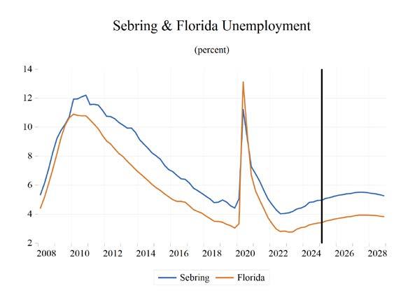The unemployment rate in Florida has fallen from its May 2020 peak of 14.2% and stands at 3.4% as of December 2024. When unemployment spiked to 14.2% in May 2020, it was 2.9 percentage points higher than the peak level of unemployment from the Great Recession. This unprecedented spike in unemployment transpired over just three months, while it took two-anda-half years for the unemployment rate to peak in the Great Recession. The December 2024 unemployment rate is up 0.3 percentage points from a year ago and is 0.7 percentage points lower than the U.S. unemployment rate.