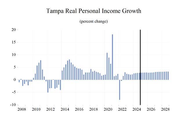 Thanks to rising inflation, real personal income contracted by 1.7% in 2022 but rose by 3.0% in 2023. Growth was 3.3% in 2024 and is expected to be 2.5% in 2025, 3.2% in 2026, 3.6% in 2027, and 3.5% in 2028. Real personal income growth during 2025-2028 will average 3.2% in Florida, weighed down a bit by slower growth and some persistent inflation in the near term, but still 0.5 percentage points higher than our forecast for the U.S.