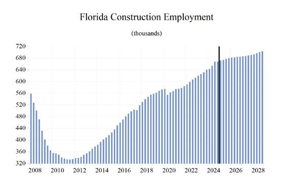 As Florida’s population and economy continue to grow, the demand for state and local government services continues to rise as well. To meet this demand, growth in state and local government employment will be necessary despite DOGE arriving in Tallahassee, but not to the levels seen during the housing boom. Average job growth in State and Local Government during 2025-2028 will be 0.8%, after annual growth hitting 2.8% in 2023 and slowing to 2.3% in 2024. The slowing economy may eventually put some pressure on both sales and property tax revenue growth (assuming the latter isn’t overturned), but this should not result in any severe budgetary issues or layoffs in the sector.