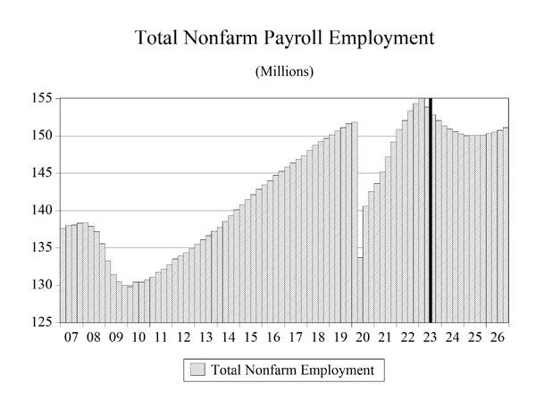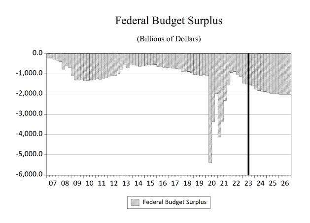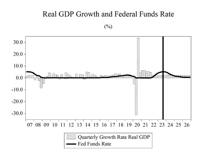 2018 2019 2020 2021 2022 2023 2024 2025 2026 2027 Composition of Real GDP, Percent Change Gross Domestic Product 2.9 2.3 -2.8 5.9 2.1 1.5 0.5 1.3 1.7 2.0 Final Sales of Domestic Product 2.8 2.3 -2.2 5.7 1.3 1.9 0.3 1.3 1.7 2.0 Total Consumption 2.9 2.0 -3.0 8.3 2.7 1.8 0.7 1.6 2.3 2.5 Durables 6.8 3.8 10.0 18.5 -0.4 2.2 -1.1 3.0 4.7 4.8 Nondurables 2.5 2.8 2.7 8.8 -0.5 -0.2 0.2 0.8 1.3 1.5 Services 2.4 1.5 -6.6 6.3 4.5 2.3 1.2 1.6 2.2 2.4 Nonresidential Fixed Investment 6.5 3.6 -4.9 6.4 3.9 1.4 -2.0 -1.5 -0.2 2.7 Equipment & Software 6.6 1.3 -10.5 10.3 4.3 -2.9 -1.3 0.0 0.0 5.7 Information Processing Equipment 7.8 2.6 1.3 9.8 5.2 -3.7 3.1 4.3 5.0 4.2 Computers & Peripherals 13.6 1.8 11.6 7.7 2.3 -5.5 6.7 5.9 7.2 6.7 Communications Equipment 5.4 3.6 -1.3 14.6 9.3 -2.4 6.9 8.1 6.8 5.8 Industrial Equipment 5.9 3.4 -8.2 11.9 5.5 -2.2 -0.7 -0.5 -1.2 3.4 Transportation equipment 5.4 -2.5 -31.3 8.4 11.7 10.0 -12.4 -5.0 -8.5 15.5 Aircraft -6.5 -41.6 34.5 29.0 16.3 17.4 -4.6 0.3 1.7 3.1 Other Equipment 15.7 2.3 -31.7 15.0 12.9 6.9 -6.5 -2.0 -3.8 -2.0 Structures 4.1 2.3 -10.1 -6.4 -6.6 6.0 -6.3 -5.0 -0.8 0.7 Commercial & Health Care 1.3 1.5 3.2 -7.6 -11.9 0.1 -10.7 -4.5 0.5 1.3 Manufacturing -1.8 5.6 -9.5 -0.7 5.4 35.3 -12.0 -18.5 -9.8 -7.3 Power & Communication -5.7 7.4 -1.7 -8.4 -19.3 -2.8 -4.3 -7.4 -5.0 3.3 Mining & Petroleum 27.8 -0.3 -38.4 14.0 14.5 -1.6 3.2 5.5 7.4 4.3 Other 1.4 -0.6 -12.9 -17.8 -4.0 8.1 -1.0 1.7 1.5 0.4 Residential Fixed Investment -0.6 -1.0 7.2 10.7 -10.6 -12.0 -1.7 4.9 1.4 0.2 Exports 2.8 0.5 -13.2 6.1 7.1 2.3 2.3 5.3 4.3 3.8 Imports 4.2 1.1 -9.0 14.1 8.1 -1.7 1.7 3.9 4.2 3.8 Federal Government 3.0 3.9 6.2 2.3 -2.5 3.0 0.6 0.6 0.5 -0.3 State & Local Government 0.9 3.0 0.4 -0.5 0.7 2.7 0.9 1.1 1.1 0.8 Billions of Dollars Real GDP 18609.1 19036.1 18509.1 19609.8 20014.1 20316.7 20420.9 20687.6 21043.5 21467.0 Nominal GDP 20533.1 21381.0 21060.5 23315.1 25462.7 26911.8 27821.2 28736.2 29758.2 30893.1 Prices & Wages, Percent Change, Annual Rate GDP Deflator 2.4 1.8 1.3 4.5 7.0 4.1 2.8 2.0 1.8 1.8 Consumer Prices 2.4 1.8 1.3 4.7 8.0 4.6 3.4 2.2 1.9 1.8 Excl. Food & Energy 2.1 2.2 1.7 3.6 6.1 5.1 3.4 2.0 1.8 1.7 Producer Prices, Finished Goods 3.1 0.8 -1.3 8.9 13.4 1.7 1.5 1.3 1.3 1.3 Employment Cost Index - Total Comp. 2.9 2.7 2.6 3.6 5.1 4.6 3.7 2.4 2.3 2.3 Other Measures Oil - WTI ($ per barrel) 64.9 57.0 39.2 68.0 94.8 83.2 87.3 92.4 95.0 98.2 Productivity (%change) 1.5 1.9 4.4 2.2 -1.7 0.7 2.1 1.7 1.3 0.8 Industrial Production (%change) 3.2 -0.7 -7.2 4.4 3.4 -0.2 -2.7 -0.7 1.0 1.8 Factory Operating Rate 78.3 77.1 72.6 77.1 79.2 78.0 75.3 74.4 75.0 75.9 Nonfarm Inven. Chg. (Bil. of 2012 $) 73.8 88.3 -46.9 -16.0 137.6 40.9 73.7 80.5 93.8 97.1 Consumer Sentiment Index 98.4 96.0 81.5 77.6 59.0 70.8 87.4 99.0 104.4 106.4 Light Vehicle Sales (Million units) 17.2 17.0 14.5 14.9 13.8 14.4 12.9 13.1 13.0 13.6 Housing Starts (Million units) 1.2 1.3 1.4 1.6 1.6 1.4 1.3 1.3 1.3 1.3 Existing House Sales (Million units) 4.7 4.7 5.1 5.4 4.5 3.8 3.6 3.9 4.2 4.6 Unemployment Rate (%) 3.9 3.7 8.1 5.4 3.6 4.2 5.8 6.3 6.1 5.6 Payroll Employment (%change) 1.6 1.3 -5.8 2.9 4.3 1.6 -1.3 -0.5 0.3 0.9 Federal Surplus (Unified, FY, bil. $) -907.3 -1052.2 -2957.4 -2835.3 -1011.0 -1654.2 -1856.9 -1940.0 -1938.5 -1940.1 Current Account Balance (Bil. $) -439.8 -441.8 -597.1 -831.4 -971.6 -835.9 -862.5 -837.6 -849.4 -861.9 Financial Markets, NSA Federal Funds Rate (%) 1.8 2.2 0.4 0.1 1.7 5.1 4.1 1.5 0.6 0.6 3-Month Treasury Bill Rate (%) 1.9 2.1 0.4 0.0 2.0 5.2 4.1 1.5 0.6 0.6 1-Year Treasury Note Yield (%) 2.3 2.1 0.4 0.1 2.8 5.1 3.6 2.1 1.5 1.4 5-Year Treasury Note Yield (%) 2.7 2.0 0.5 0.9 3.0 3.9 3.0 2.3 2.0 1.9 10-Year Treasury Note Yield (%) 2.9 2.1 0.9 1.4 3.0 3.7 3.2 2.6 2.4 2.3 25-Year Treasury Note Yield (%) 3.1 2.6 1.6 2.1 3.1 3.8 3.5 3.0 2.8 2.7 30-Year Fixed Mortgage Rate (%) 4.6 4.1 3.2 3.0 5.4 6.7 5.9 4.8 4.3 4.1 S&P 500 Stock Index 2744.7 2912.5 3218.5 4266.8 4100.7 4184.1 4158.5 4207.6 4363.8 4579.8 (Percent change) 12.1 6.1 10.5 32.6 -3.9 2.0 -0.6 1.2 3.7 4.9 Exchange Rate, Major Trading Partners 1.2 1.3 1.2 1.2 1.3 1.3 1.2 1.2 1.2 1.2 (Percent change (negative = depreciation)) -2.3 3.5 -1.1 -4.1 10.2 -1.8 -3.5 -1.8 -1.7 -1.7 Incomes Personal Income (Bil. of $) 17683.8 18587.0 19832.3 21294.8 21777.2 22872.4 23793.3 24843.8 25985.9 27129.0 (Percent change) 5.0 5.1 6.7 7.4 2.3 5.0 4.0 4.4 4.6 4.4 Disposable Income (Bil. of $) 15608.9 16388.6 17595.9 18633.1 18580.6 19977.7 20943.1 21898.0 22887.4 23866.6 (Percent change) 5.5 5.0 7.4 5.9 -0.3 7.5 4.8 4.6 4.5 4.3 Real Disposable Income (Bil. Of 2012 $) 14410.1 14907.9 15835.2 16130.0 15126.7 15622.3 15896.5 16320.2 16786.5 17241.4 (Percent change) 3.3 3.5 6.2 1.9 -6.2 3.3 1.8 2.7 2.9 2.7 Saving Rate (%) 7.6 8.8 16.8 11.9 3.5 4.5 5.1 6.1 6.6 6.8 After-Tax Profits (Billions of $) 1960.0 2007.4 2110.9 2749.8 2872.2 2847.3 2936.2 2966.0 3083.5 3227.2 (Percent change) 3.3 2.4 5.2 30.3 4.4 -0.9 3.1 1.0 4.0 4.7