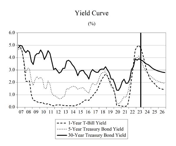 • The housing market remains tight. High prices plus 7% mortgage rates have eroded demand. However, persistently low inventories will reinforce the sector. Housing starts will decline from 1.6 million in 2022 to 1.4 million in 2023, and 1.3 million in 2024, and remain at this level through 2026.