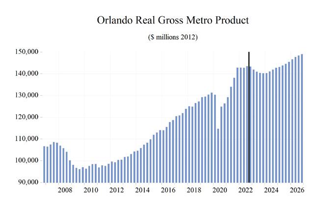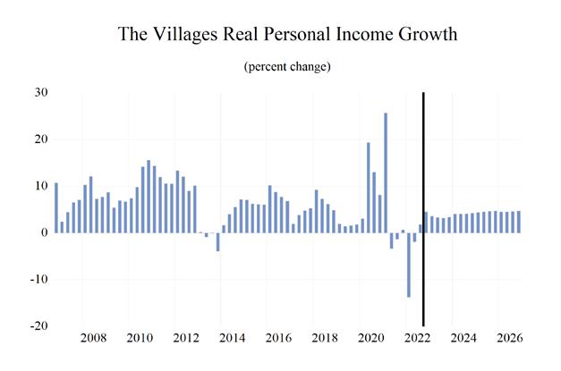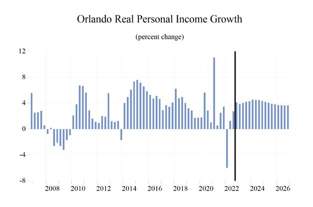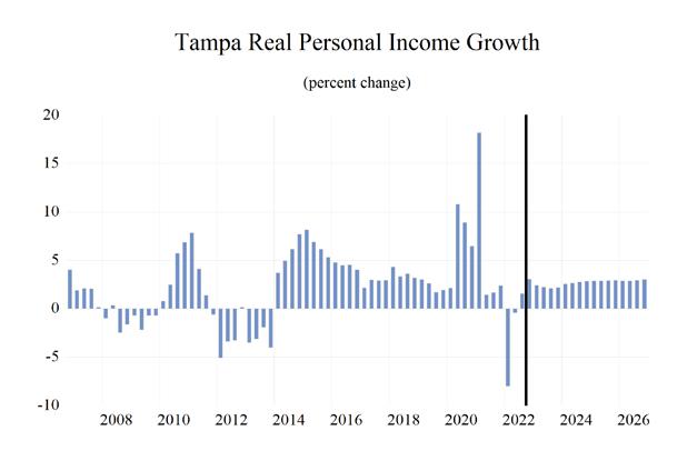 credits. Real personal income contracted by 2.2% in 2022, but then rose by 0.3% in 2023, 1.4% in 2024, 3.2% in 2025, and 2.9% in 2026 as the recession and inflation get further in the rear-view mirror. Real personal income growth during 2023-2026 will average just 2.0% in Florida, weighed down by the recession and inflation in the near term.