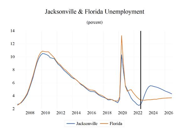 In 2023, the effects of the recession will turn job growth negative. Total payroll jobs will contract by 0.8% in 2023, and again by 2.1% in 2024. Florida’s job growth will resume in the second half of 2024, and in 2025, job growth will be 0.5% rising to 1.1% in 2026. Florida’s labor market will slightly underperform the national economy until 2026.