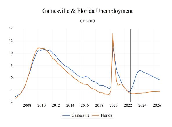 Low inventories of existing homes for sale and lagging housing starts growth since 2016 contributed to an environment where home prices rose at a rapid pace. The shortage in the singlefamily market will be partially ameliorated as high prices, due to the rapid appreciation of the past several years, have prompted sellers to get off the sidelines. However, the recession will result in a slowdown in housing starts. A tight housing market may be a persistent feature of Florida’s economy over the next several years.