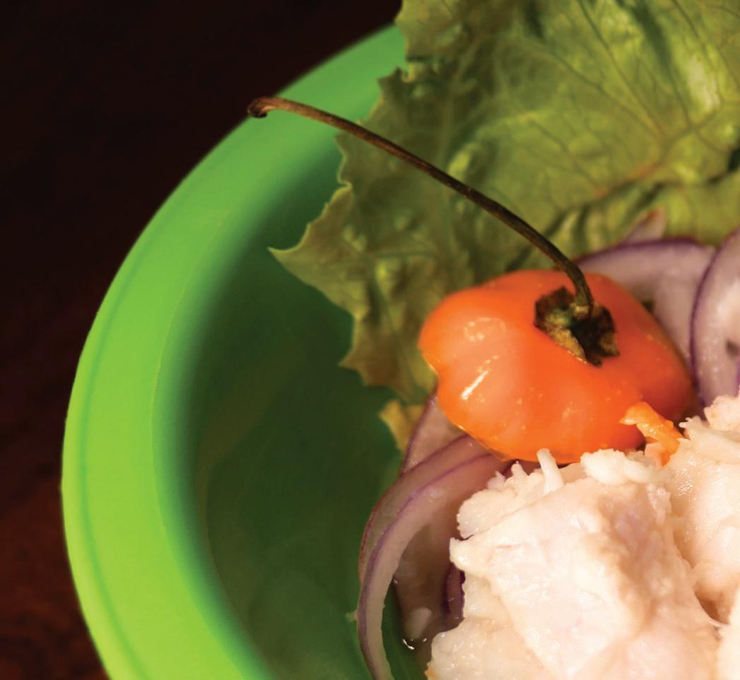 The atmosphere at the end-ofcourse celebration was friendly but punctuated by anxiety. After all, the students’ food was about to be judged by an award winning, celebrity chef. I observed as they rushed from the kitchenette to the column of folding tables, taking elements out of plastic containers and wiping the rims of plates with paper towels. Some even pulled out tweezers to properly place individual leaves of cilantro around a piece of browned meat. I approached fourth-year student Lamont Rhodes first who, along with his partner Nina Maxin, brought Pastelón as their dish, described by Rhodes as “Caribbean Lasagna.” Made with layers of ripe plantains, ground beef and mozzarella cheese, he explained that this hybridization of Italian and Caribbean was created by Puerto Rican and Dominican populations in New York because “they wanted to have like their