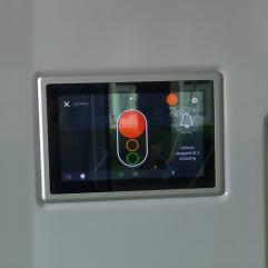 The shuttle can communicate with traffic lights thanks to the implementation of an onboard unit (OBU), a communication device that receives transmissions from RSUs. The RSU is mounted on the mast arm pole, which is the vertical component that holds the traffic lights.