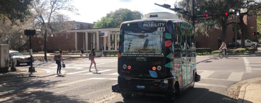 On any given day, Gainesville’s Autonomous Shuttle (AV) can be seen driving around city streets, interacting with pedestrians, bicyclists, and conventional vehicles, while picking up and dropping off riders along its route. AV shuttle corridors across the country are mostly designed without traffic lights, or the shuttles are maneuvered through traffic lights manually by an attendant. However, the Gainesville AV is different.