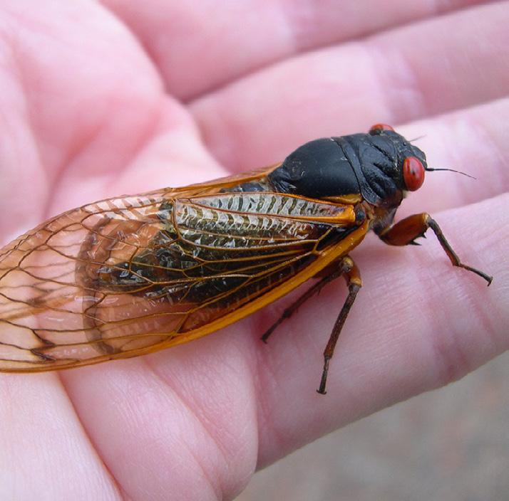 Emerging every 13 years, the Great Southern Brood of cicadas have black bodies, red eyes, and translucent, orangetinted wings. Their cousins, the annual cicadas, are larger, with green bodies and black eyes.