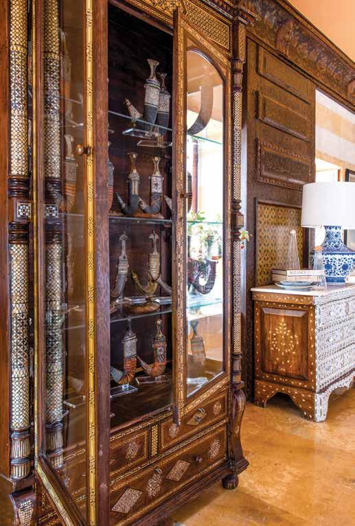 A vibrant blend of cultural influences, this room in Zeina Aboukheir’s Mar Mikhael residence showcases intricate Syrian inlay furniture, vivid 1950s armchairs, and a dynamic modern painting, capturing the essence of a timeless Oriental elegance.
