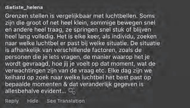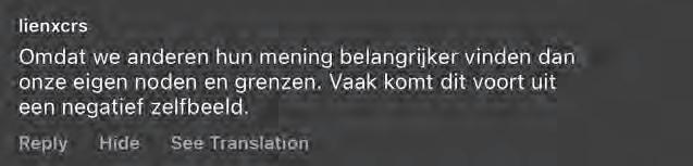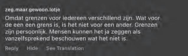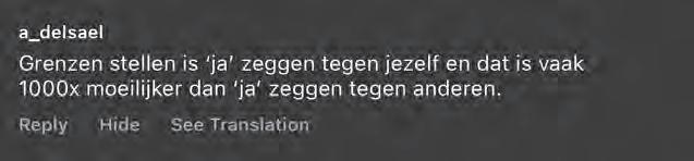 Liene deelt iets bijzonder interessants in haar comment: ‘Het is moeilijk om je grenzen te stellen als je zelf niet weet wat je grenzen zijn.’ Ze slaat de spijker op de kop. Het is al lastig om te definiëren wat grenzen zijn, laat staan om je eigen grenzen te kennen en die dan ook nog eens te bewaken.