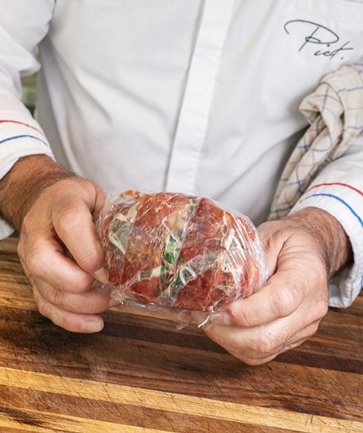 5 Snijd het vlees in schijfjes van 1 centimeter. Door het vlees niet te dun en niet te dik te snijden zal de bakwijze mooi sappig blijven. Schik tussen ieder schijfje een sneetje ham en een sneetje kaas.