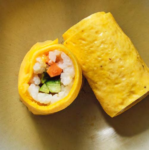 Klop in een andere kom de eieren samen met de mirin los (gebruik geen garde, want het mengsel mag niet schuimig worden). Breng op smaak met peper en zout.
