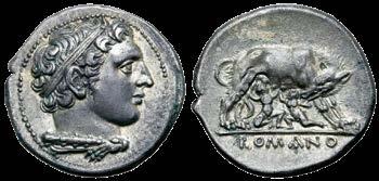 Zilveren didrachm, 269–266 BC, de eerste munt die geslagen werd in Rome.