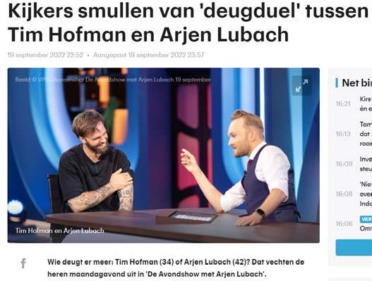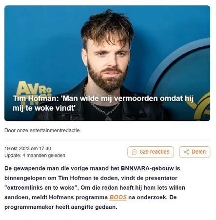 ‘I k kom eraan, moment.’ Woensdag 19 januari 2022, tien over elf ’s avonds. We lopen de lift uit, en de andere leden van de crew lopen rechtdoor om plaats te nemen op een redactie naast die van ons; die van Kinderen voor Kinderen . Daar is ’s avonds de achtergrond in het shot net iets mooier dan op onze redactie. Ikzelf schiet naar rechts, het toilet in. Wankel rits ik mijn broek open en probeer te plassen. Lukt niet. Laat maar dan, broek weer dicht. Prima. Ik loop naar de spiegel, zet mijn handen op de wasbak en hang even naar voren. Godverdomme hé. Vanavond geen ruimte voor fouten. Het moet goed zijn. Inhoud, toon en scherpte. Vooral dat laatste: luister aandachtig naar wat hij zegt, volg op met een vraagteken. Geen uitroeptekens, laat hem het werk doen. Ik hoor de stem van Manon Blaas, eindredacteur van Zembla , echoën in mijn hoofd. ‘Blijf kalm, wees waarachtig.’