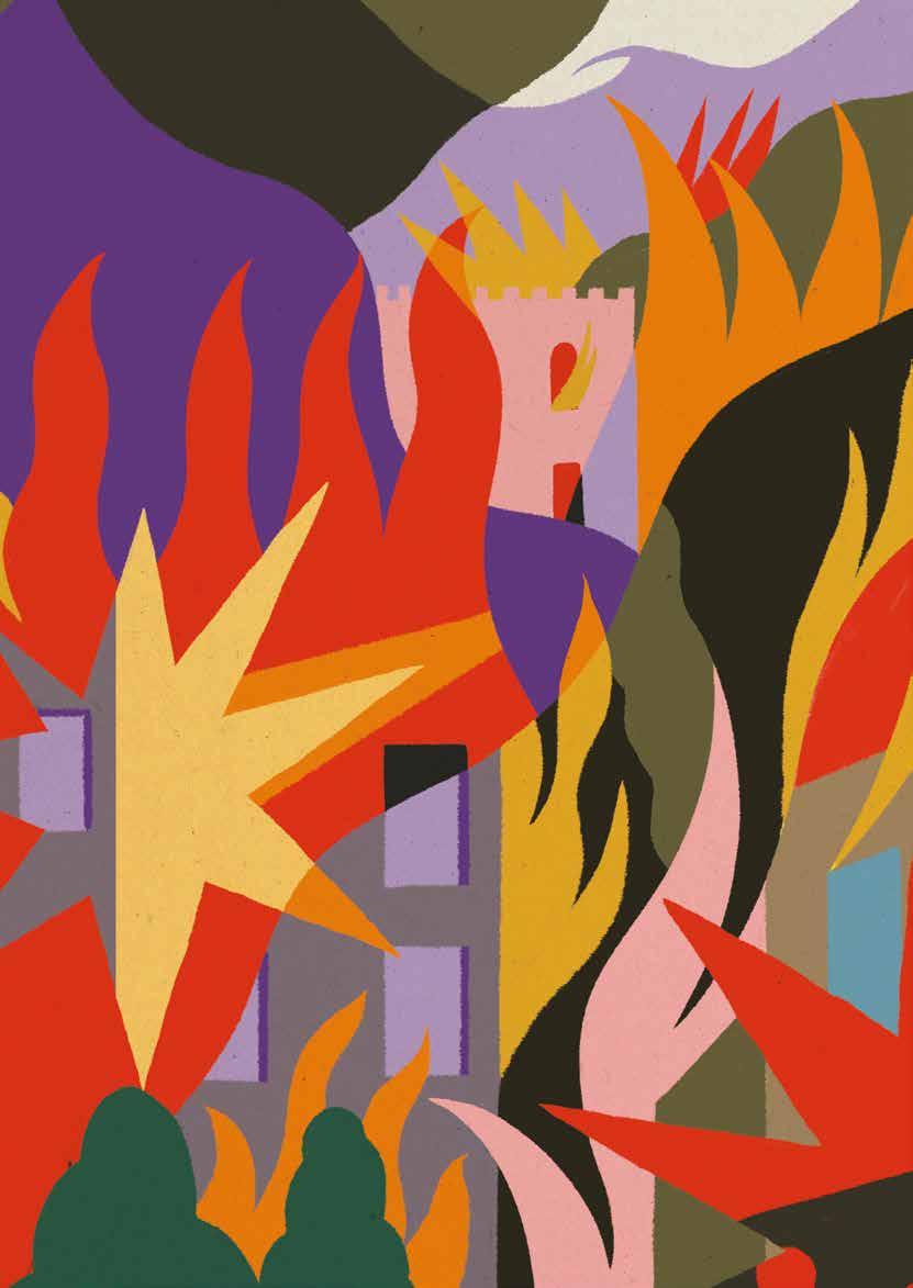 ‘“Jullie winnen!” gilt ze naar de heuvels. En dan begint ze te lachen, slaat ze dubbel, valt ze lachend op haar knieën. En daarin, vermengd met haar gelach, hoort ze het schelle gelach van het kleine vrouwtje in april, en ze denkt aan Franjo, Dubravka en haar moeder die deze brand de volgende dag in Engeland op het ochtendnieuws zullen zien – haar familie, met wie ze geen contact kan krijgen, die ze al drieënhalve maand niet meer heeft gesproken, zal kapot zijn van ongerustheid – en nog steeds kan ze niet ophouden met lachen. De wind gaat even abrupt liggen als hij is opgestoken.