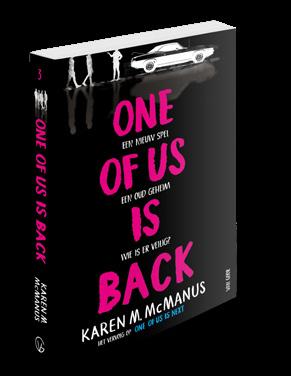 One of Us Is Back | Karen M. McManus | oorspronkelijke titel: One of Us Is Back | vertaling: Willeke Lempens omslagontwerp: Saskia Janssen | paperback | 336 blz. | 14 x 21,5 cm | isbn 978 90 00 39292 6 | nur 285 (Fictie 15+) isbn 978 90 00 39312 1 | € 5,99