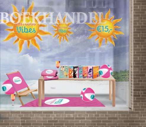 • Etalagepakket voor de boekhandel met zonnige plafondhanger, roze strandlaken en strandbal. Bij bestelling van 25 assorti Feelgood Vibes-titels