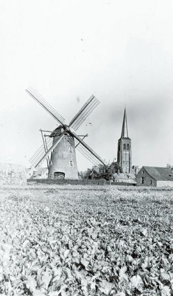 Er zijn maar weinig foto’s waarop de Willibrorduskerk én molen De Onvermoeide aan de Heuvelstraat samen staan afgebeeld. Bijgaande foto uit 1948 van Harrie Sevens vanuit de toen nog onbebouwde Vroonacker is er zo één.