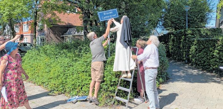 Onder het toeziend oog van heel veel vrijwilligers die actief zijn op het Catharinadal hing zuster Maria Magdalena zondag het bordje Blauwe Camerdreef op, nadat initiatiefnemer Walther Halters het oude naambordje had verwijderd. “U mag op het trapje om het nieuwe bord te bevestigen, bent u nog dichter bij de hemel”, grapte hij.