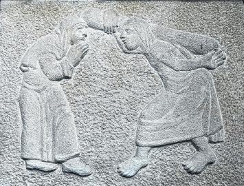 De Ontmoeting van Jezus met zijn moeder Maria ontbrak. Was die kapotgegaan bij de verwijdering? Was hij ontvreemd? Weggegeven? Gelukkig gaf hij er twee mee in bruikleen. Die hebben zowel in het stadhuis als in Theek 5 tentoongesteld gestaan. En daar zag ook pastoor Jochem van Velthoven die prachtige kunstwerken. In zijn St-Jansbasiliek hangen al fraaie glyptieken van Steenbergen en ook het hoofdaltaar is van deze kunstenaar. Wat zou deze Kruisweg schitterend aansluiten bij die werken.