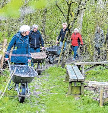 vrijwilligers eveneens aan de slag. Gelukkig zowel van de Rotary De Warande als via NLdoet. Want in het voorjaar was er weer genoeg te doen in een tuin van 1 hectare groot. Zo moesten alle teeltbedden worden voorbereid op het nieuwe seizoen. Iedereen kreeg een paar handschoenen en laarzen te leen. Dat was bepaald geen overbodige luxe in de natte kleigronden van de Dommelbergse polder, vruchtbare grond vol met pieren. Er werden kruiwagens vol onkruid afgevoerd naar de composthoop. Andere vrijwilligers gingen aan de slag met het aanbrengen van schapenvacht in de bedden voor de permacultuur. Of zetten teeltbedden uit en bedekten de looppaden met stro.