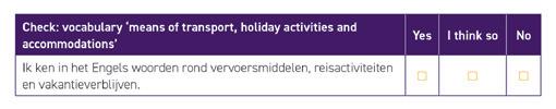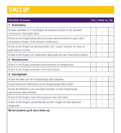 Tijdens de unit krijg je regelmatig de kans om een check of checklist in te vullen. Daarin geef je voor jezelf en je leerkracht aan wat je al kunt en waarop je nog moet oefenen.