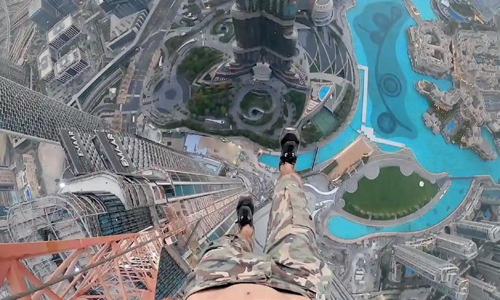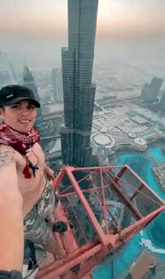 The stunt was carried out at 5.45 a.m. on the crane on top of the 77-storey skyscraper, Il Primo, directly next to the world’s tallest building, the Burj Khalifa. In his seven-minute YouTube video, mostly filmed using a GoPro, he shows his hands, and splashes his hat with water to cool down in what he says was 45°C heat.