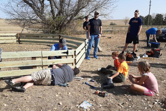 Afterthefirstholewasdugandthepostwas poundedintoplace,thelowerboardwasattachedtomeasuretothenextpostplacement. Theprocesscontinuesaroundtheoctagonuntilthefirstandlastpostareattachedandthe pitisclosed.Atthispoint,anadditionalhole isdugtoallowforapostwhichwillmakethe frameofagateforthepit.Whilestudents andfacultyaddedthesecondandthirdboards toeachside,thegatehingesandlatchwere