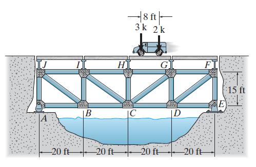 Drawtheinfluencelinefortheforcein memberICofthebridgetrussanddetermine themaximumforce(tensionorcompression) thatcanbedevelopedinthememberduetoa 5-ktruckhavingthewheelloadsshown.Assumethetruckcantravelineitherdirection alongthecenterofthedeck,sothathalfthe loadshownistransferredtoeachofthetwo sidetrusses.Alsoassumethemembersare pinconnectedatthegussetplates.