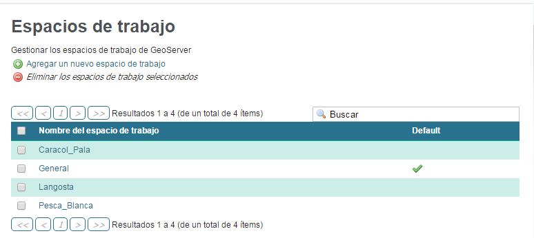 Figura 39 Proceso de importación de datos a GeoServer Los espacios de trabajos presentes en el GeoServer al igual que en el DBMS fueron creados teniendo en cuenta el tipo recurso pesquero.