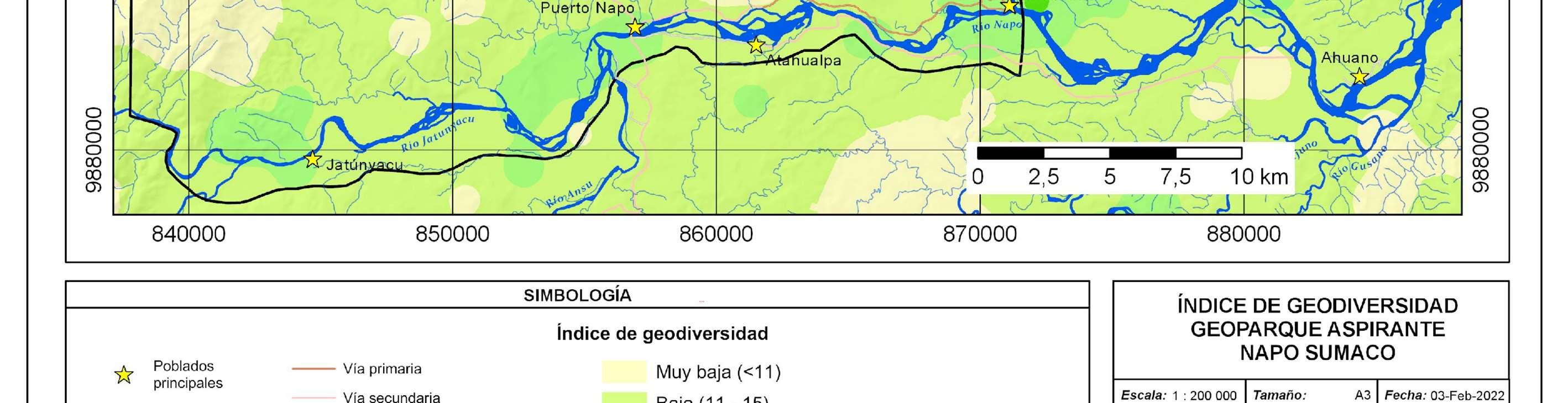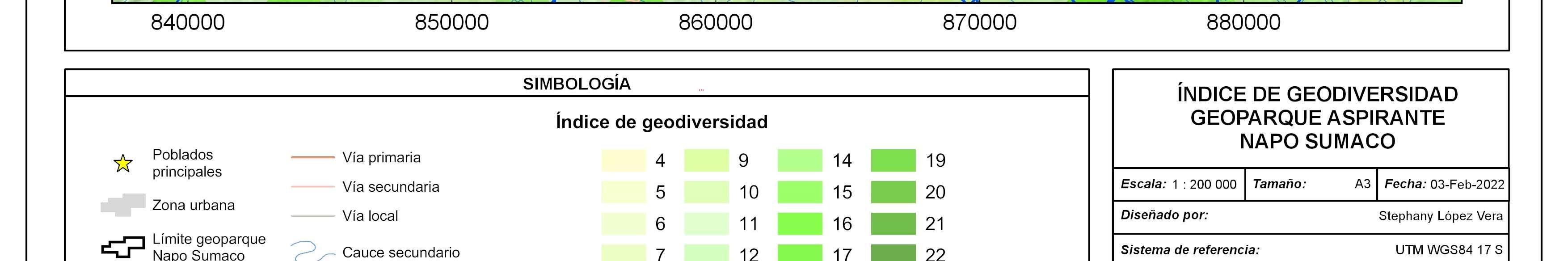 Al tratarse de una reserva natural y tomando en cuenta que se encuentra dentro del Sistema Petrolífero subandino del Ecuador, se esperaría que la geodiversidad delgeoparqueNapoSumacoAspiranteUNESCOseaaltaamuyalta.Sinembargo, hayqueconsiderarquelosrangosdeclasificacióndegeodiversidadplanteadospor Pereira et al. (2013), fueron establecidos en base a los índices mínimo y máximo obtenidos en el caso de estudio del Mapa de Geodiversidad del Estado de Paraná (Brasil), donde yace una mayor variedad y abundancia de litologías, minerales y fósiles por sus condiciones de evolución geológica.
