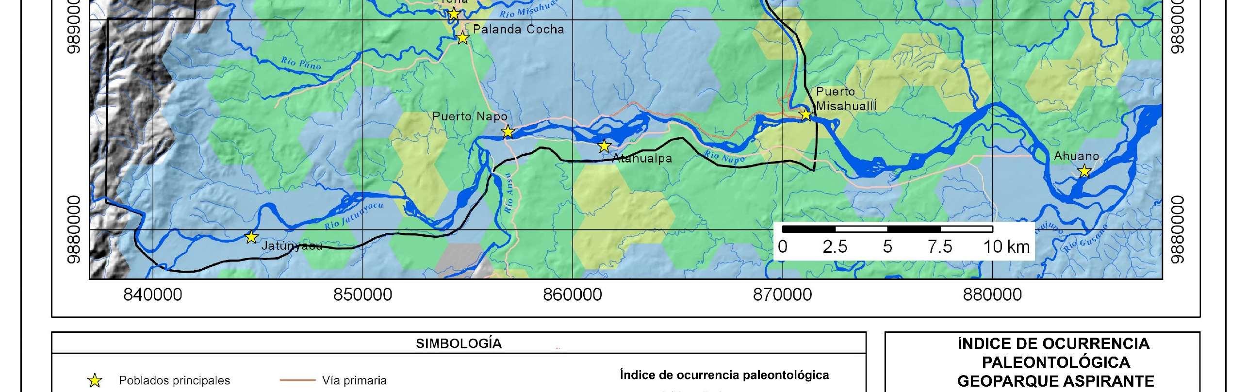 ElmayoríndicedeocurrenciapaleontológicadelgeoparqueNapoSumacoes3,su presencia y distribución atípica en dirección N-S, marcaría el contacto entre las unidades bioestratigráficas Hollín, Napo y Tena. Mientras que, el índice de ocurrencia paleontológica de mayor predominancia en la extensión del geoparque es 2.