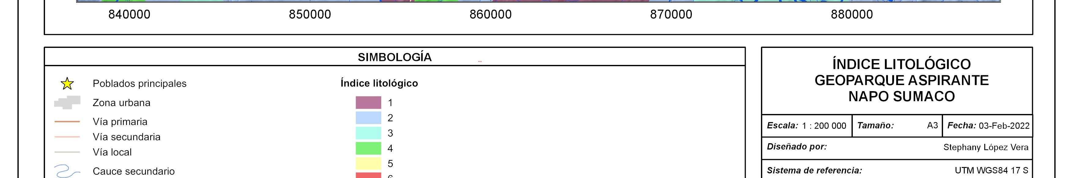 La cuantificación del índice litológico demuestra que en la mayor parte de la zona de estudio yacen de 2 a 4 unidades litoestratigráficas. Casos puntuales como al norte de Puerto Misahuallí se observa la existencia de hasta 5 unidades litoestratigráficas,relacionadoalaportedelosdepósitosfluvialesdelríoMisahuallí, mientras que, en el límite occidental del geoparque yace solamente un tipo de litología relacionado a la intrusión del batolito de Abitagua.