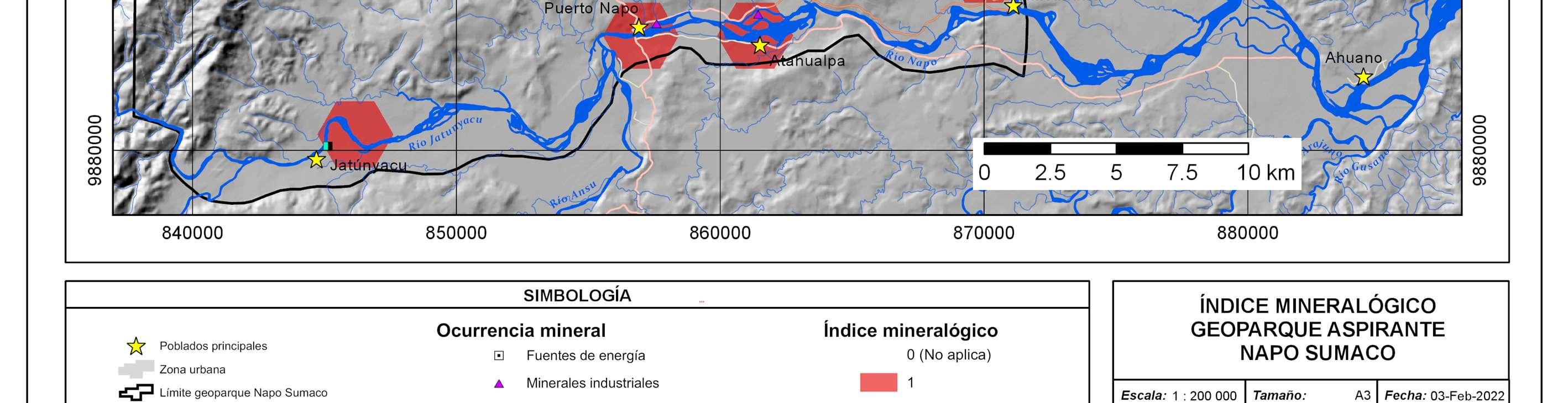 Finalmente, la cuantificación del índice de ocurrencia mineral demostró que el mayor valor obtenido fue 1. Se esperaría que al encontrarse el geoparque dentro del sistema petrolífero de la Zona Subandina y en el límite de la Cordillera Real, el índice de ocurrencia mineral fuese mayor, pero la escala de levantamiento a nivel regional de la ocurrencia mineral representa una limitación para su correcta valoración, causando su subestimación.
