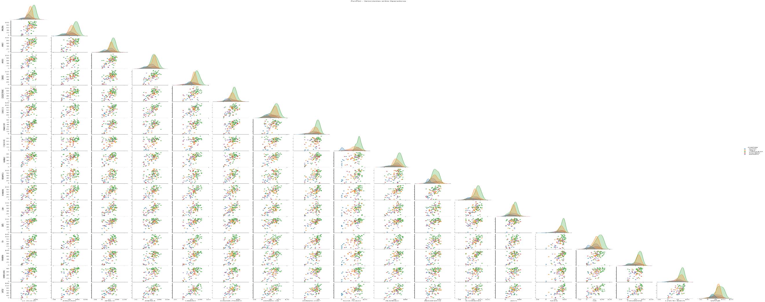 12 Ilustración 4.8. Matriz de gráficos de dispersión e histogramas de la Variable Velocidad (km/h) entre Operadoras de la ruta Quito-Latacunga 93 Ilustración 4.9. Multicorrelación de la Variable Velocidad entre Operadoras de la ruta Quito-Riobamba 94 Ilustración 4.10. Matriz de gráficos de dispersión e histogramas de la Variable Velocidad (km/h) entre una muestra de las Operadoras de la ruta Quito-Riobamba 95 Ilustración 4.11. Modelos de regresión lineal para las operadoras de la ruta Quito-Ambato 97 Ilustración 4.12. Diagramas de caja de variables no espaciales 100 Ilustración 4.13. Histogramas de variables no espaciales 101 Ilustración 4.14. Matriz de multicorrelación entre variables descriptivas 102 Ilustración 4.15. Identificación de operadoras atípicas en el conjunto de datos104 Ilustración 4.16. Identificación de grupos de operadoras 105 Ilustración 4.17. Matriz de multicorrelación entre el Índice de Moran y variables influyentes 108 Ilustración 4.18. Gráfico de dispersión entre el índice de Moran y dos factores influyentes en las empresas de transporte......................................................... 109 Ilustración 4.19. Relación espacial entre el índice de Moran y factores influyentes en las empresas de transporte 110 Ilustración 4.20. Estrategias planteadas para el control y la planificación de transporte 116
