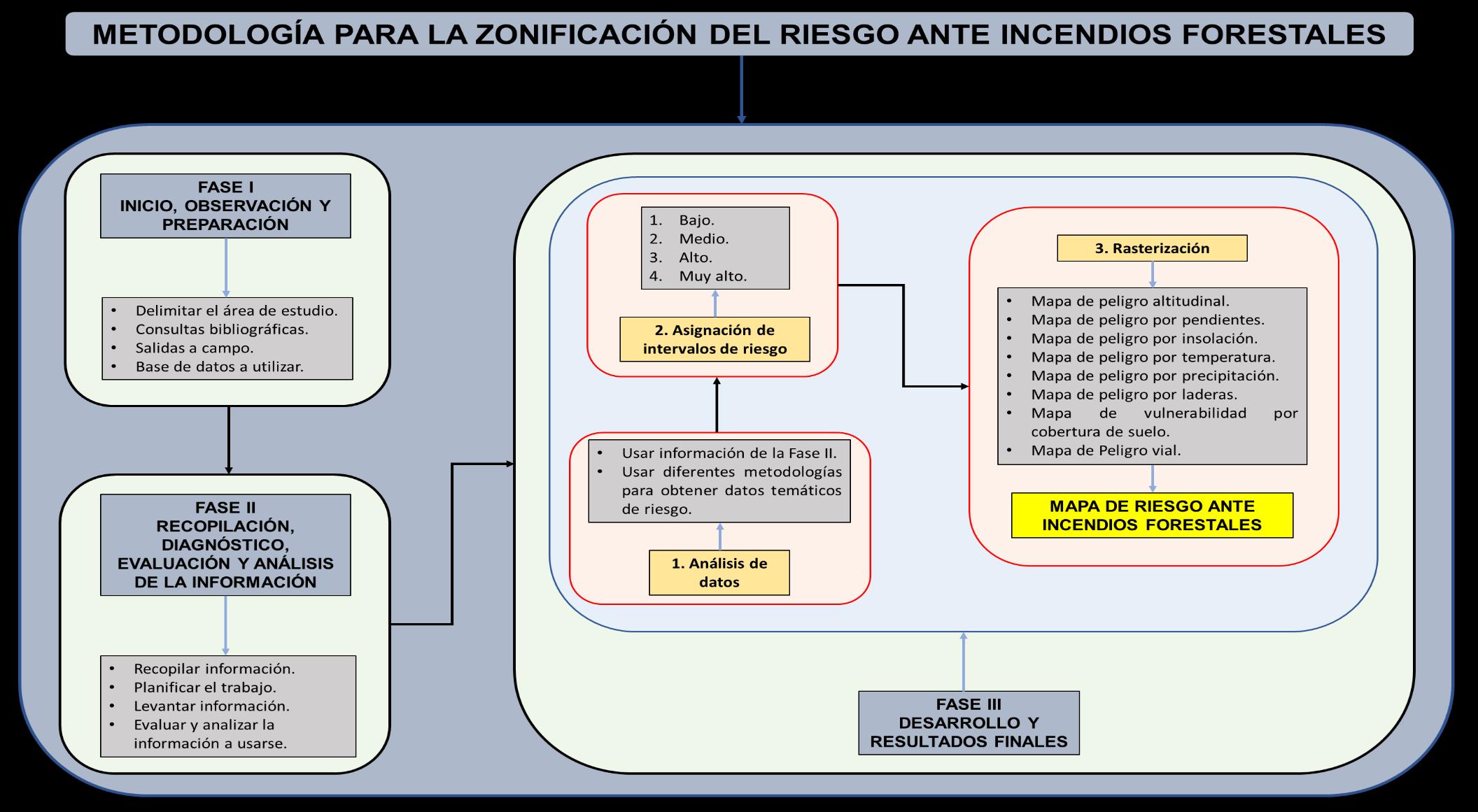 El presente trabajo de investigación busca evaluar y zonificar el riesgo a incendios forestales en el Cantón Guaranda, a través del uso de los SIG y el análisis de varios casos presentes en distintos países, el cual permitió elaborar y desarrollar una metodología que consta de tres fases primordiales (Figura 25.), con la finalidad de crear el mapa de riesgo a incendios forestales.