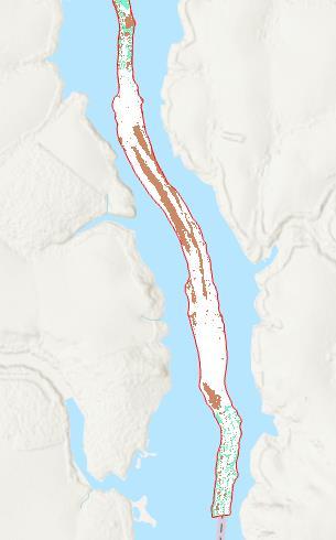 Según el mapa de distribución espacial (Figura 4.12), se observa un delta sobre el canal principal, a unos 12 km aproximadamente aguas abajo del inicio del área piloto. Los monitoreos históricos de secciones transversales batimétricas muestran que dicha zona es vulnerable al proceso de sedimentación.