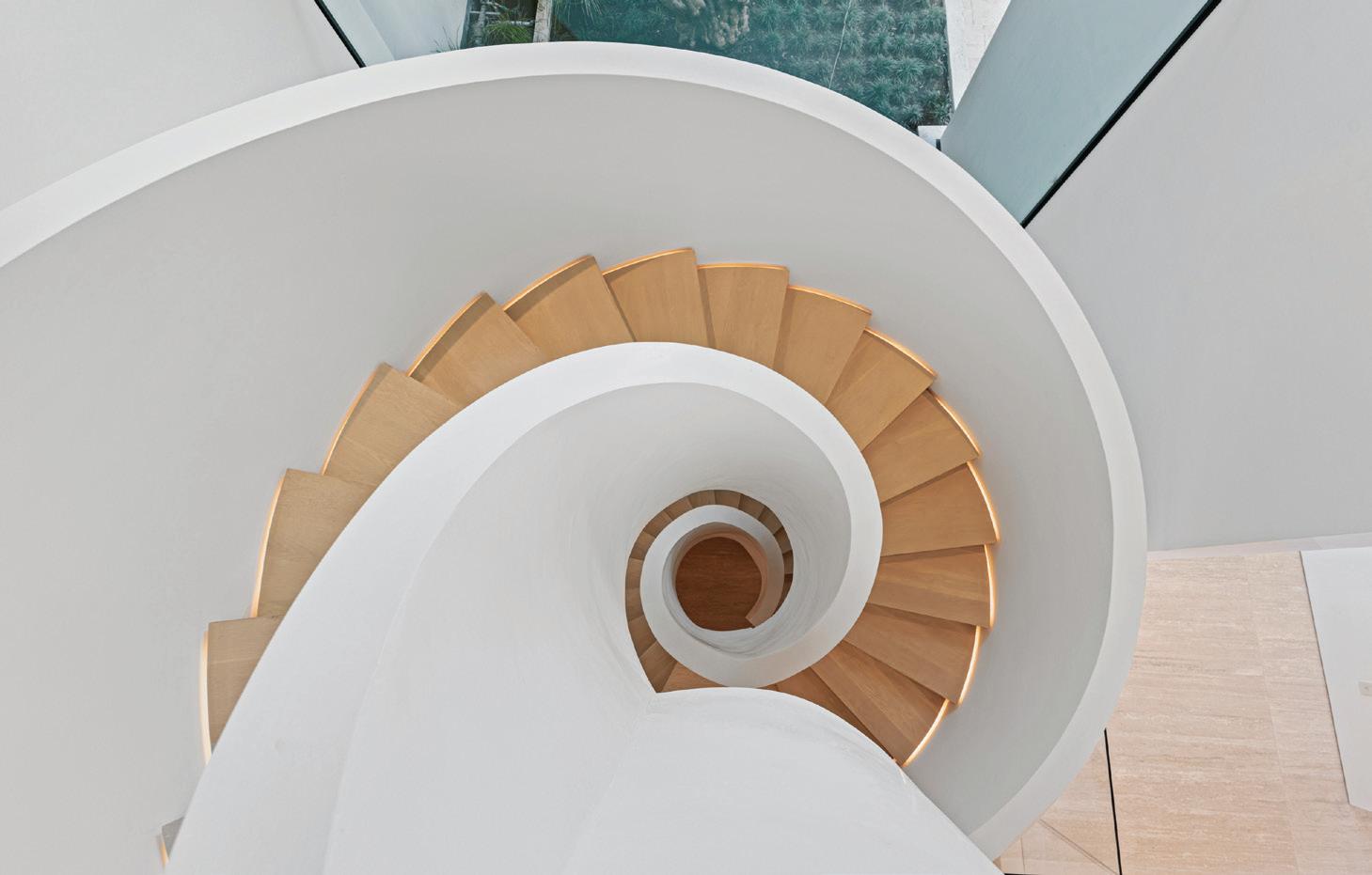 Navigating tight regulations while increasing livability and property value required creativity. The team reconfigured the interior, transforming a former maze-like layout by replacing three staircases with a single sculptural one and reclaiming space by eliminating hallways. “The design emphasizes reductive elegance, with aligned elevations and pure structural forms,” says Oppenheim.