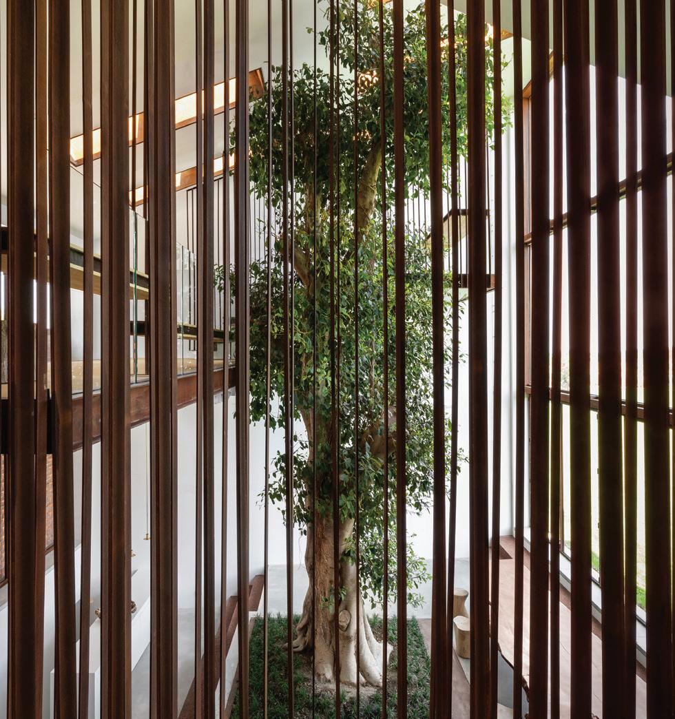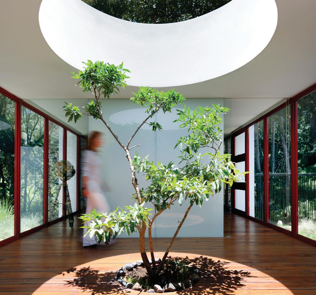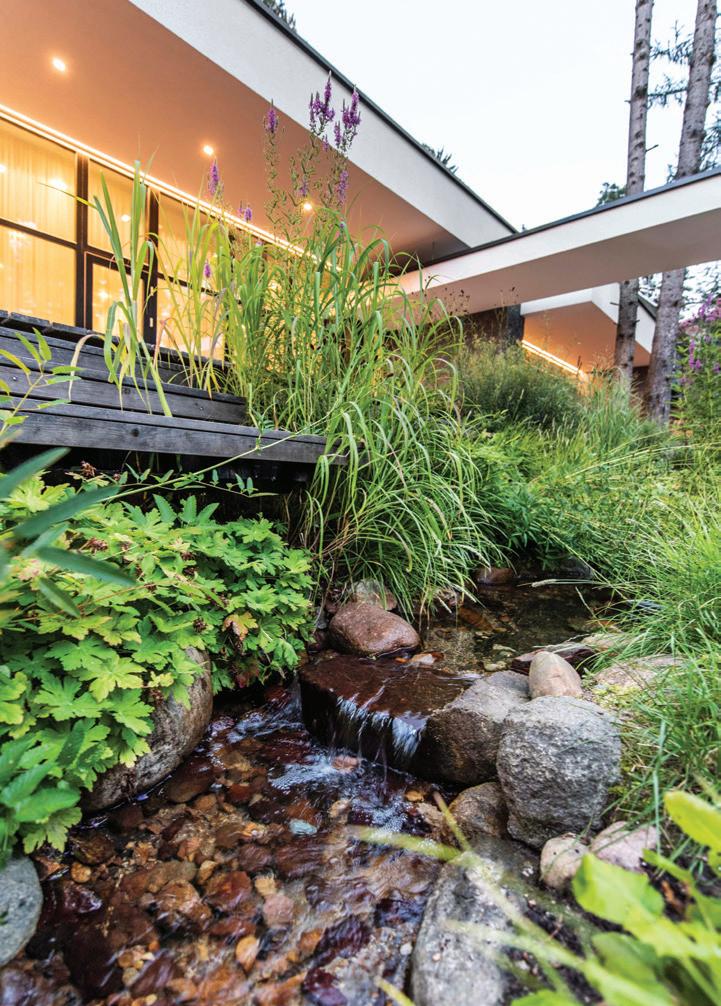 Innovative architecture incorporates environmental elements such as living trees and streams