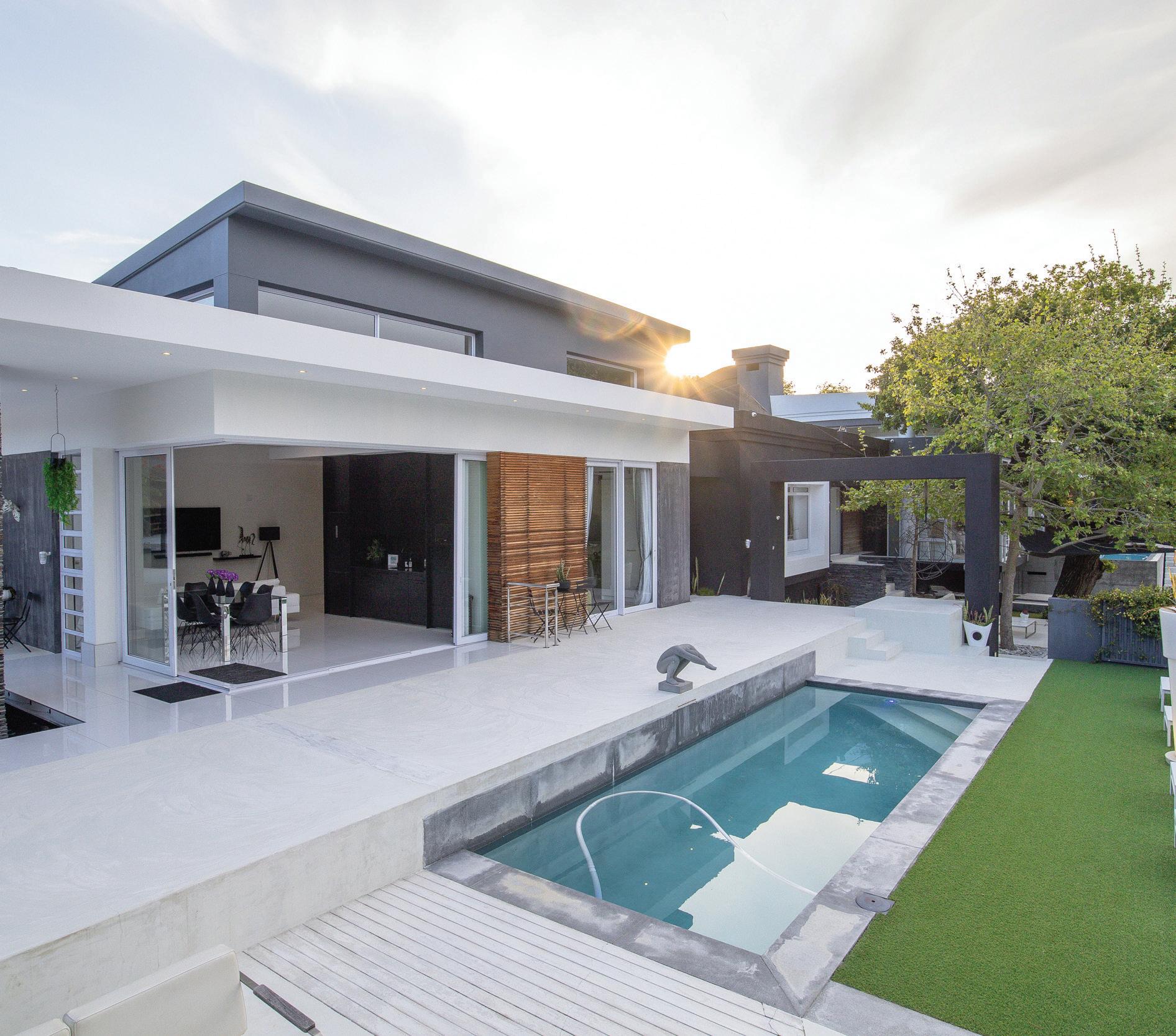 Welcome to this majestic home, nestled in the heart of Nova Constantia on an expansive 1.5-acre plot. This modern home is a true marvel of design and craftsmanship, offering an unparalleled living experience. As you arrive, you’ll be greeted by a meticulously landscaped garden filled with diverse fynbos plants, creating a serene oasis. Its north-facing orientation ensures that you’ll enjoy ample sunlight and breathtaking views of the surrounding mountains. The home boasts two swimming pools, including one that is heated, perfect for year-round relaxation.