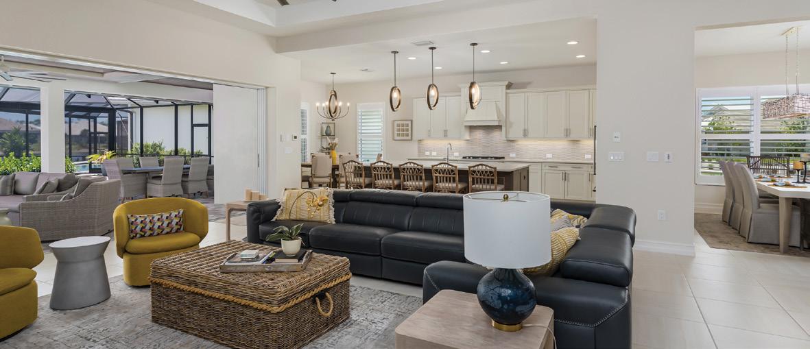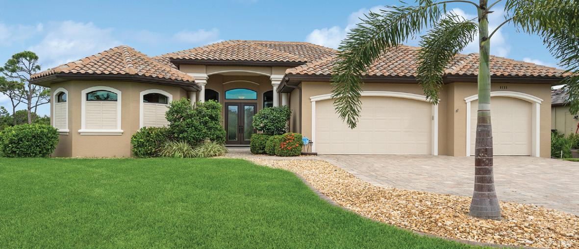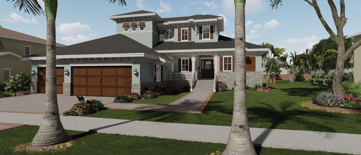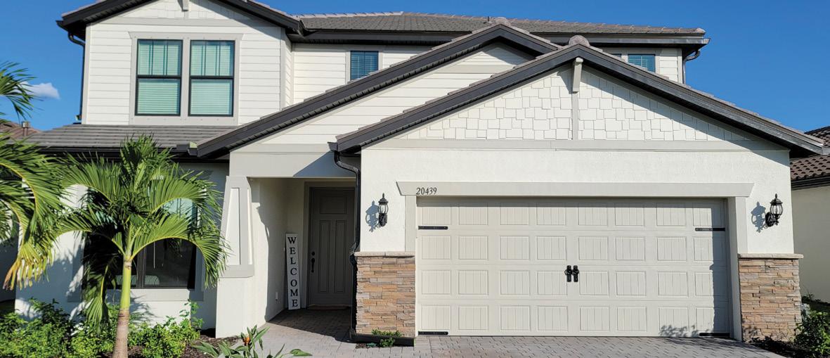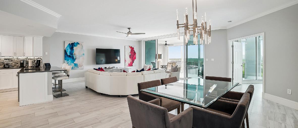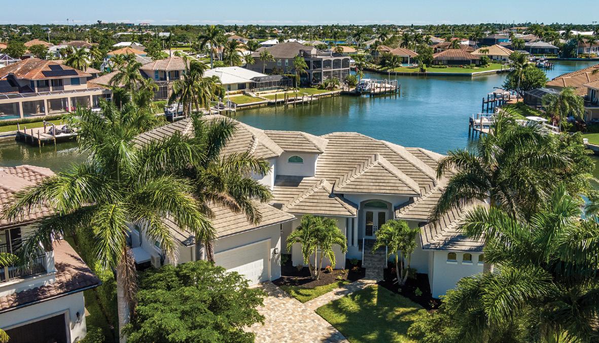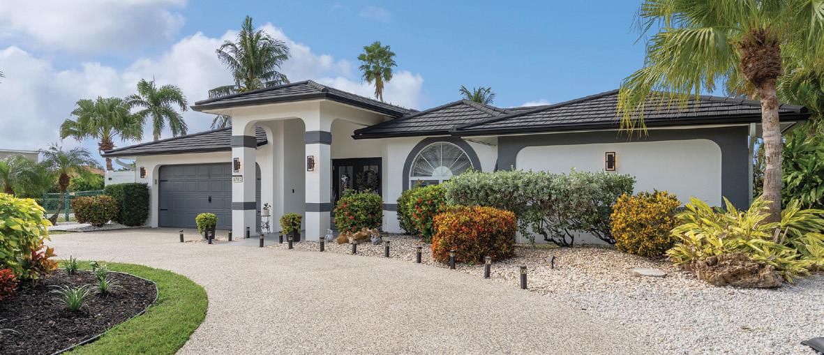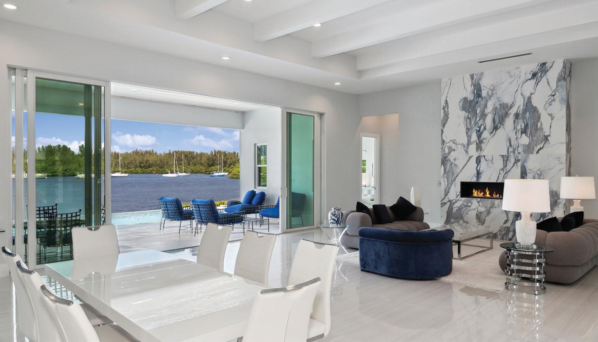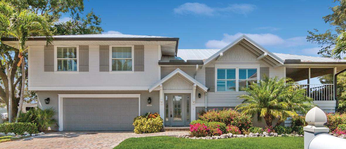 This brand-new waterfront home features 5,424 square feet of living space, 4 bedrooms, 4.5 baths, an elevator, an infinity-edge pool, mature landscaping, and breathtaking water views. The shared dock comes with a lift and is in a no-wake zone, making it easy to explore the azure waters of the Gulf Coast.